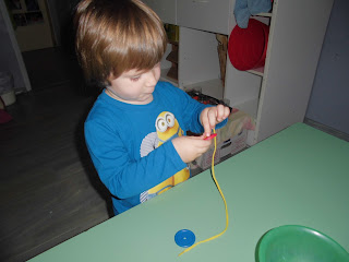 Aquest material els va donar moltes possibilitats: van fer passar el cordill pels forats comprovant que hi havia cordills que passaven i d'altres no, van fer seriacions i agrupacions aprofitant que hi havia botons de diferents colors, feien dibuixos amb el cordill i els omplien de botons,... van fer moltes descobertes i nous aprenentatges.